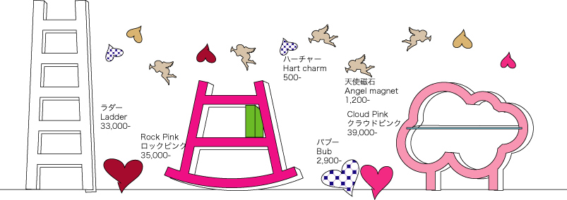 ハーチャー キーホルダー ¥500- 天使磁石 \1,200- バブー クッション ¥2,900- ロックピンク ロッキング棚 ¥35,000- クラウドピンク ガラス付き棚 ¥39,000- ラダー 棚 ¥33,000- X 1 2 3 4 5 6 7 8 9 10